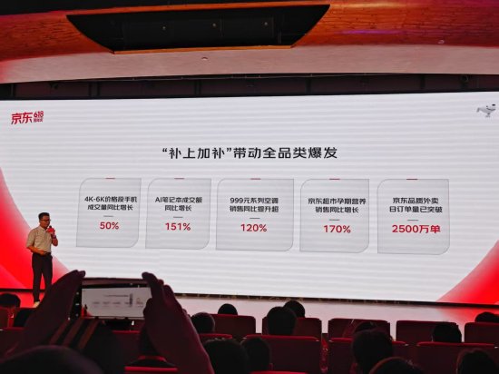 在“补上加补”带动下,京东全品类爆发:4K-6K价格段手机,成交量同比增长50%;AI笔记本成交额同比增长151%;999元系列空调销售同比提升超120%;京东超市孕期营养销售同比增长170%;京东品质外卖日订单量已突破2500万单。微单相机新品成交额同比增长201%,潮流盲盒新品成交额同比增长150%,超3000个家电家居品牌“闪电新品”销售同比增长超过100%。